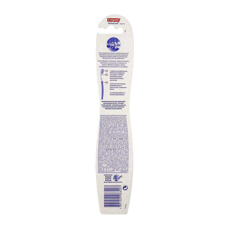 فرشاة أسنان كولجيت أورثوجارد لطب الأسنان التصحيحي مزودة بشعيرات متعددة المستويات أو على شكل حرف "U". تزيل الشعيرات الخارجية الطويلة والمتدببة طبقة البلاك على خط اللثة، بينما تقوم الشعيرات الداخلية الأقصر بتنظيف المناطق المحيطة بالأسلاك المعدنية.