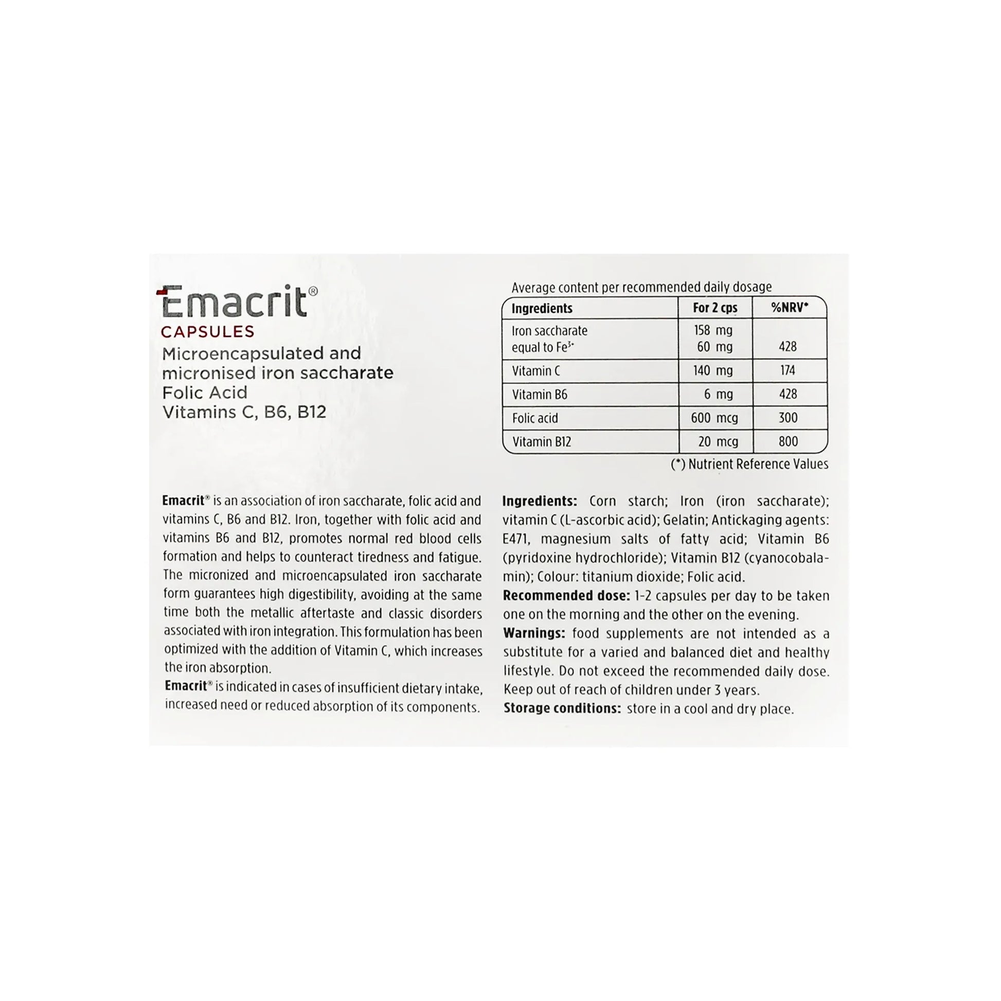 Additionally, emacrit capsules contain iron sucrose, which not only helps alleviate the metallic taste commonly associated with iron supplements but also reduces the likelihood of stomach discomfort.