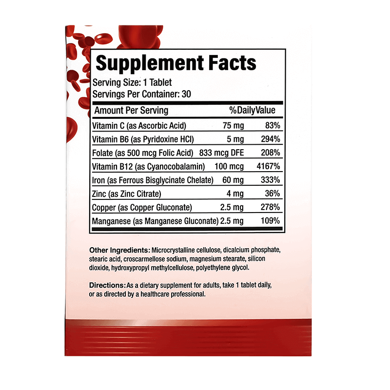 الحديد، حمض الفوليك، فيتامين سي، مجموعة فيتامينات ب، الزنك