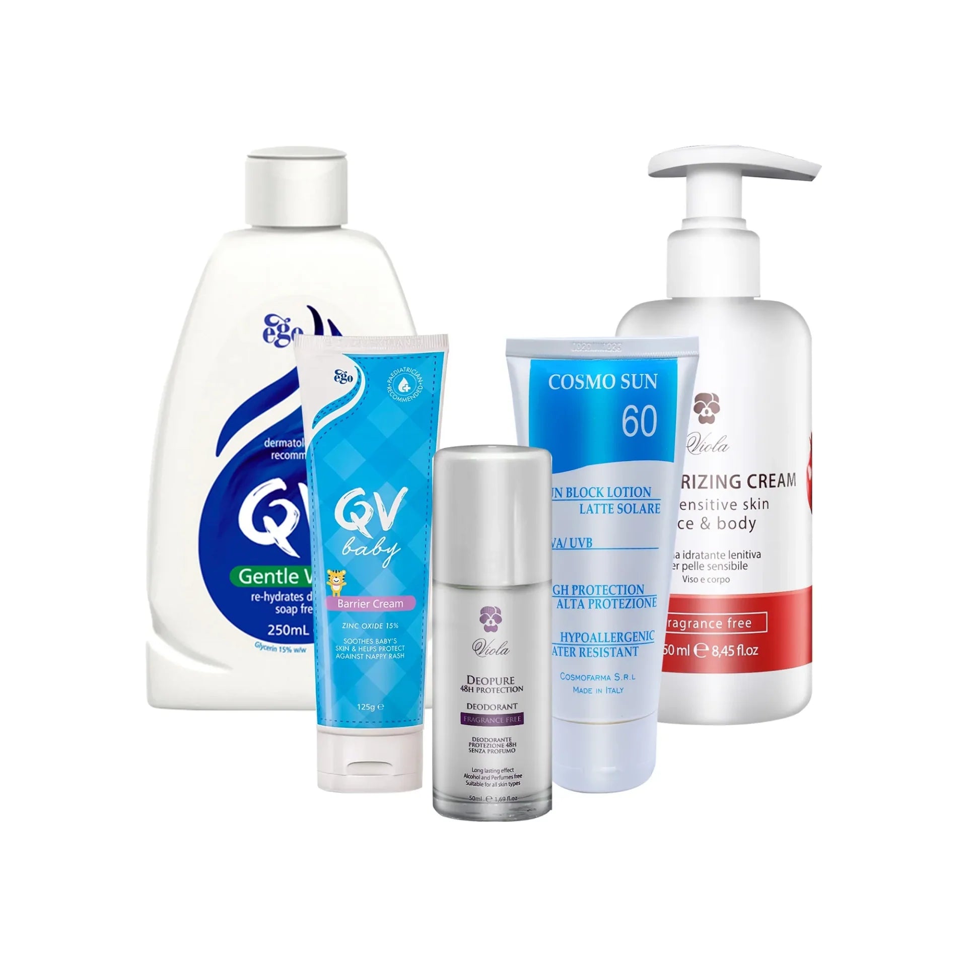 The kit also features QV Hypoallergenic Cleanser, formulated to gently cleanse the skin and remove impurities while preserving its natural moisture balance.