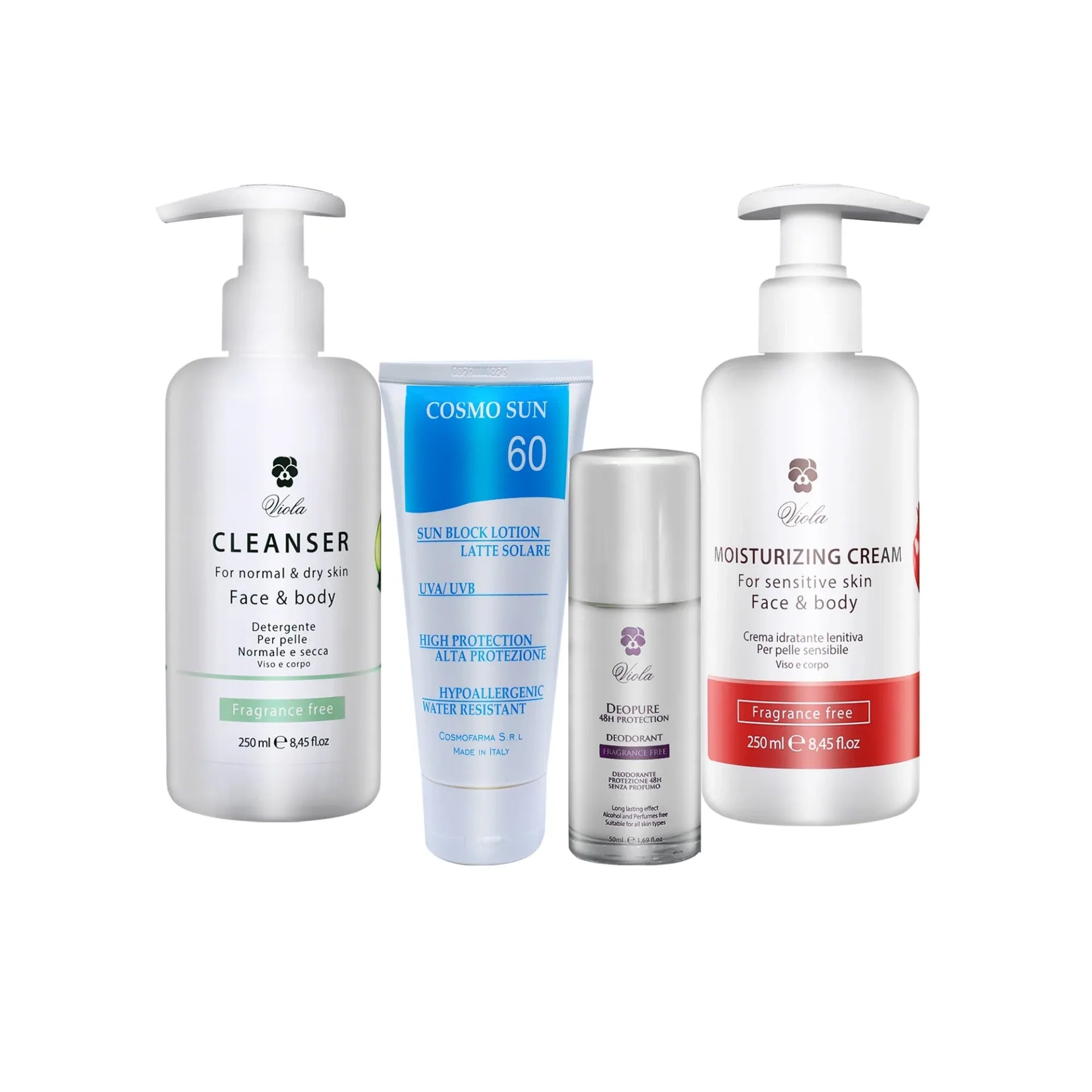 This kit includes Viola Fragrance-Free Moisturizer for face and body, featuring a light, fast-absorbing formula that combines a range of ingredients to moisturize the skin, leaving it feeling comfortable and refreshed.