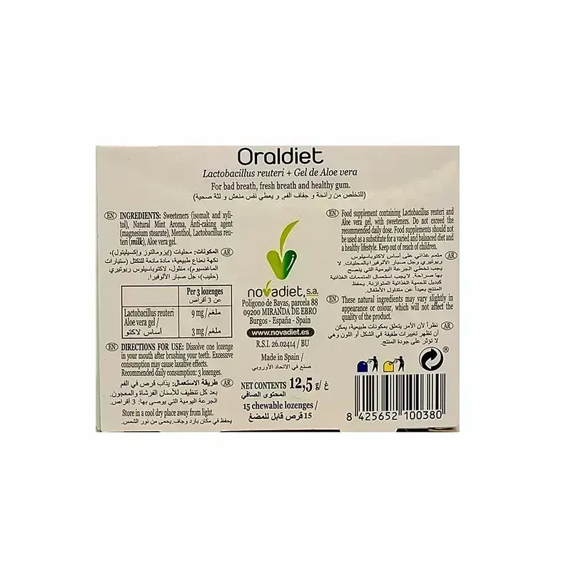 أقراص نوفادييت أورالدايت هي أقراص قابلة للمضغ يمكن استخدامها للتخلص من رائحة الفم الكريهة الناتجة عن البكتيريا.تحتوي هذه الأقراص على جل الصبار والبكتيريا المفيدة "لاكتوباسيلوس ريوتيري" كمكونات فعالة.