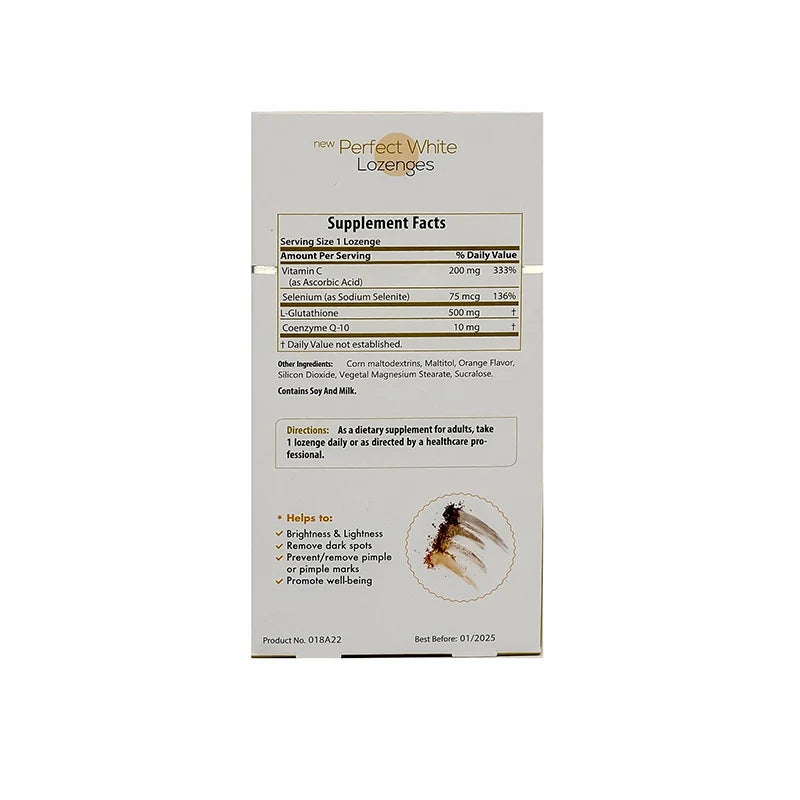 Perfect White is an exceptional whitening lozenge formulated with a powerful blend of anti- aging and skin- lightening ingredients, resulting in healthy and radiant skin.The inclusion of L- Glutathione and Vitamin C, renowned antioxidants, effectively reduce skin pigmentation and dark spots, thereby promoting a unified skin tone and a refreshed appearance.