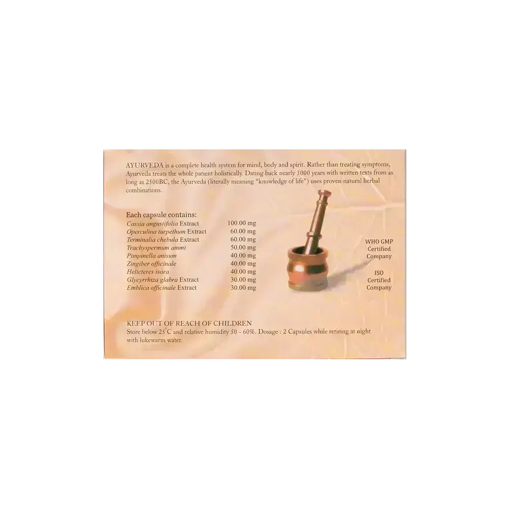 Ayu-Lax capsules improve the digestive process, reduce digestive problems, and treat constipation.These capsules include a combination of carminative and laxative plant extracts such as Operculina Turpethum Extract and Cassia Angustifolia.