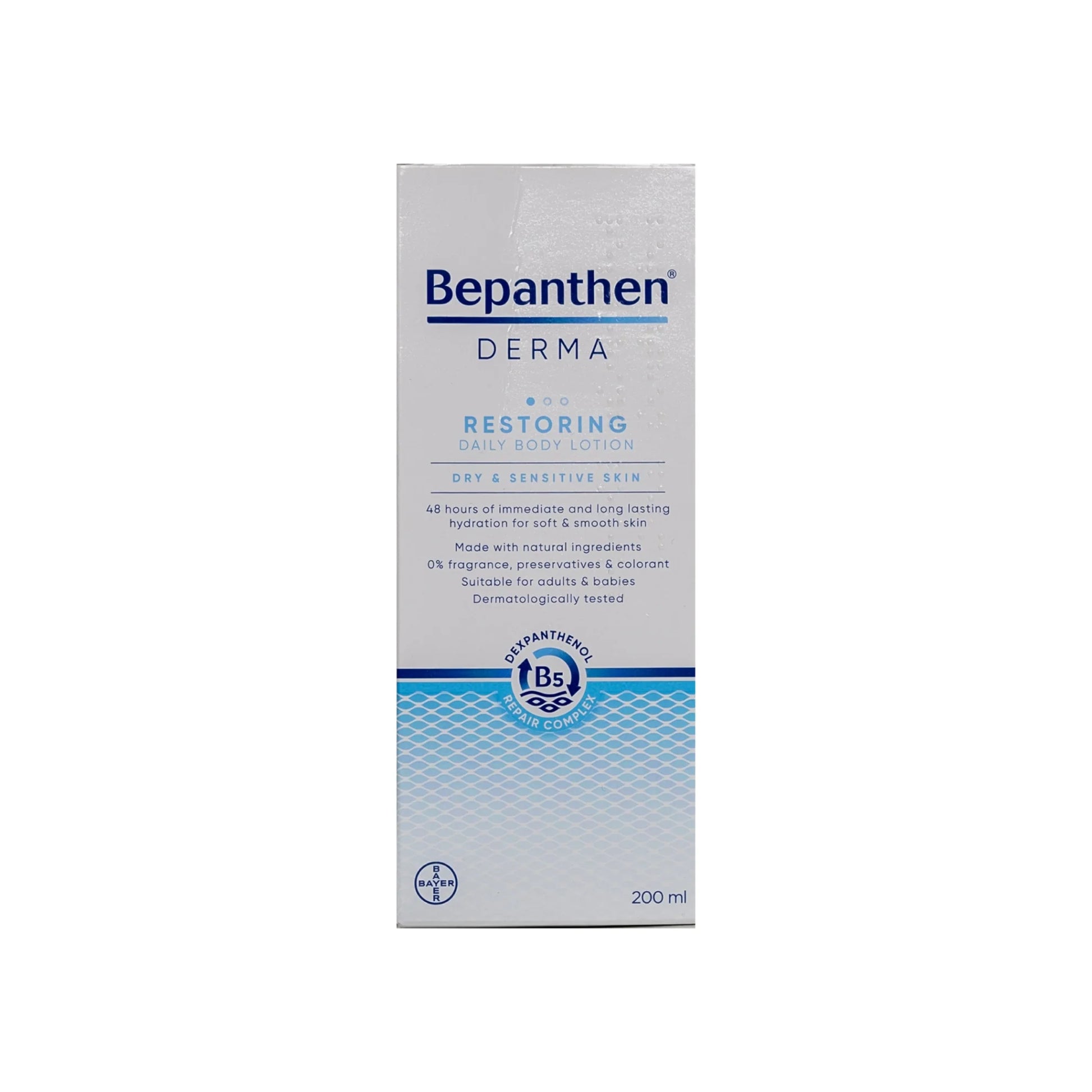 Bepanthen Derma Restoring Lotion for dry and sensitive skin provides deep hydration and comprehensive care, effectively eliminating the symptoms of dryness permanently.Bepanthen Body Lotion has a light, non-sticky texture that absorbs quickly, delivering immediate and effective relief to dry, irritated skin.
