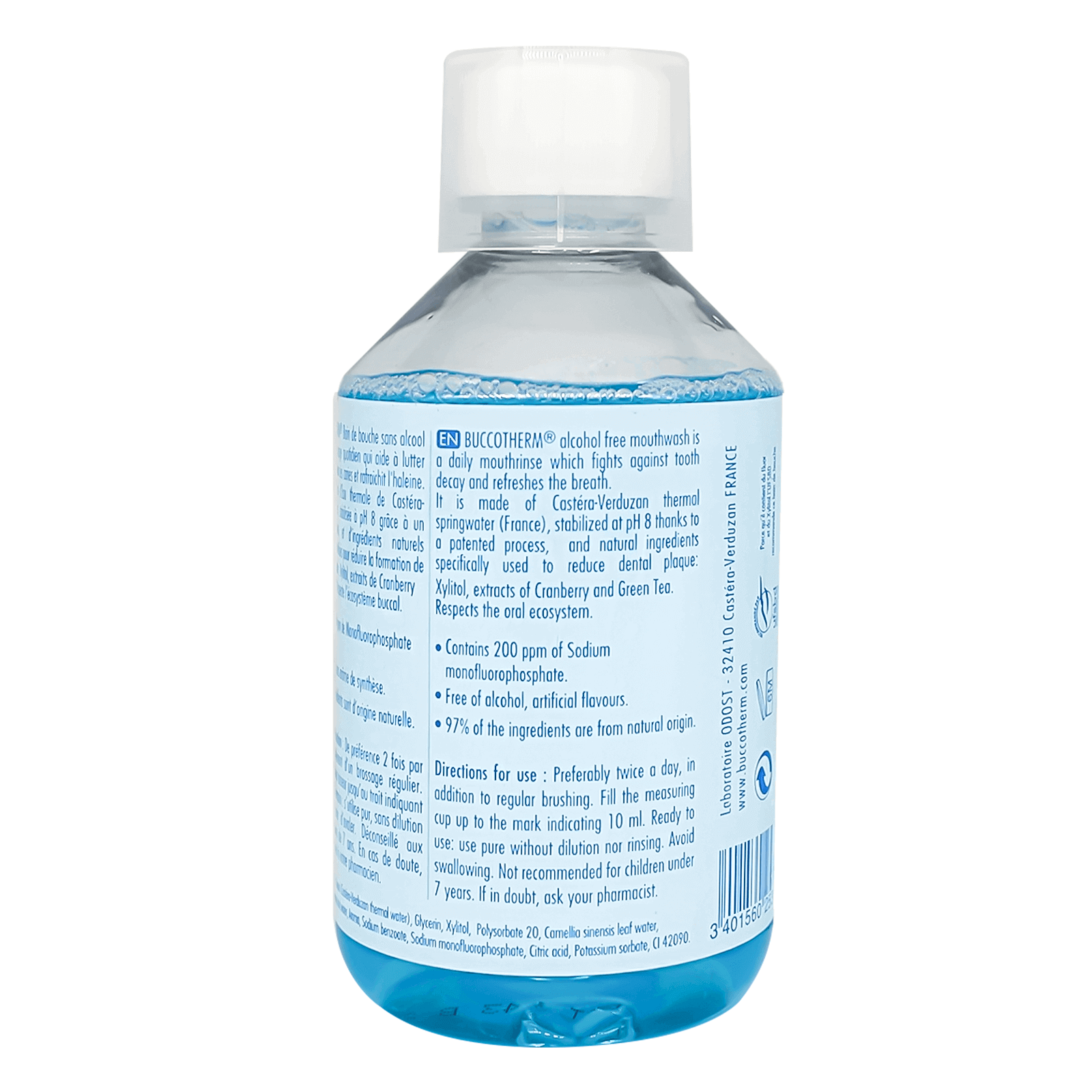 Mouthwash Alcohol-Free for Daily oral hygiene help to protect against bad breath and helps to prevent plaque and cavities. It is suitable for delicate gums and can be used daily.Buccotherm Mouthwash formulated with:
