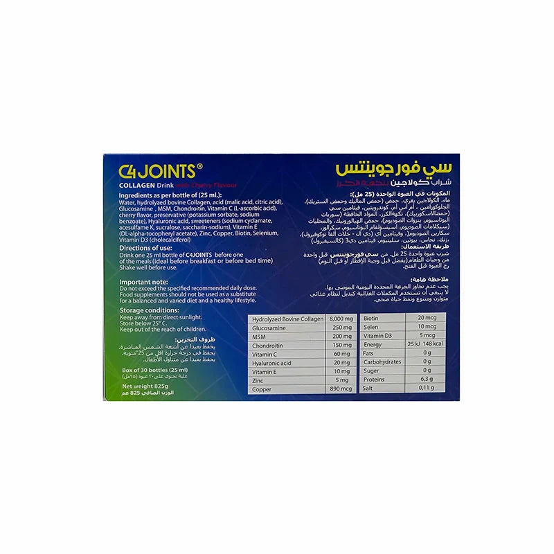 C4 joints collagen is a collagen drink that is effective in supporting joint health.The main active ingredient is Collagen which is the protein found in connective tissues that plays an important role in the strength and structure of muscles, ligaments, cartilage, and bones.