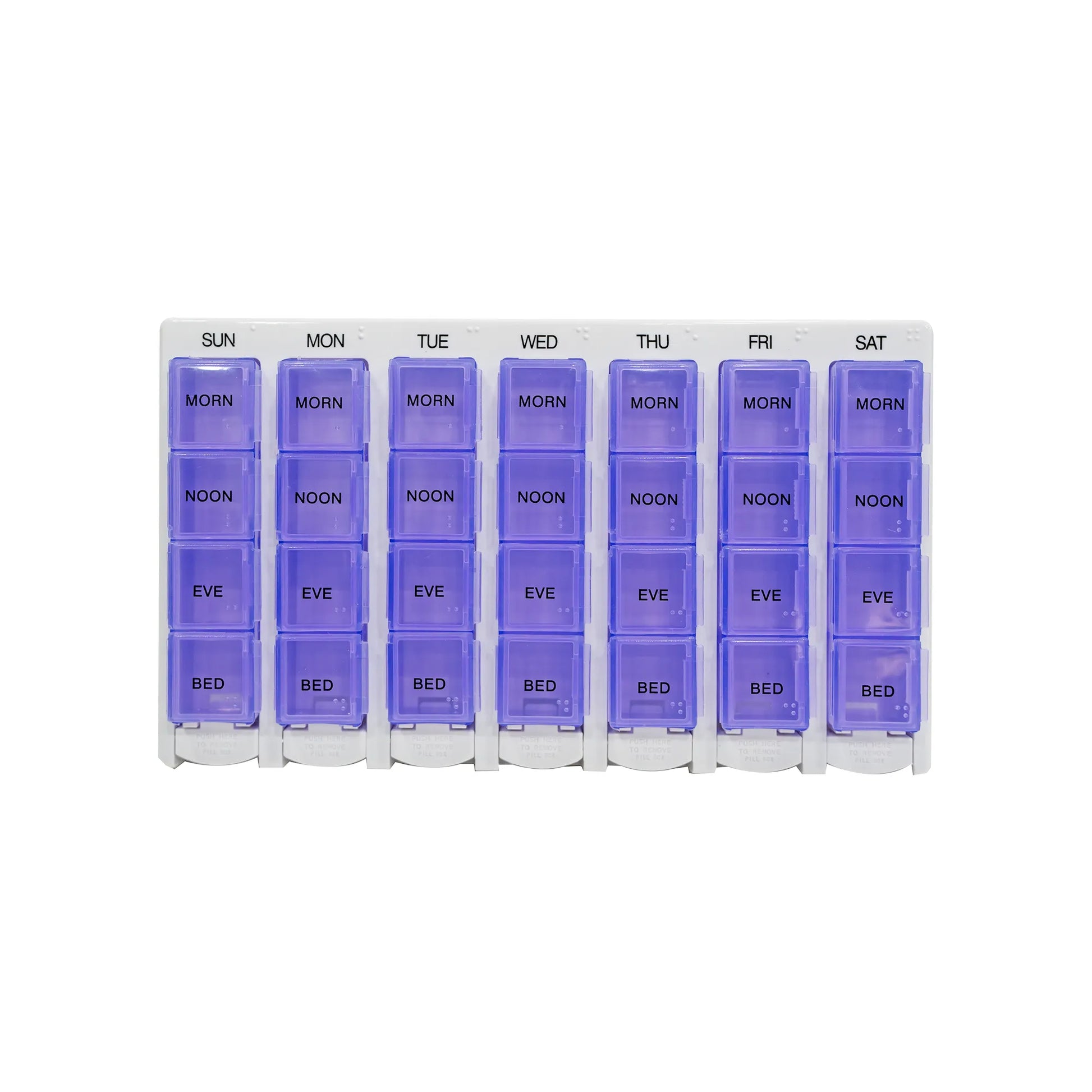 The Pill Box is provided with the letters of the days of the week with the daily dose schedule symbols each printed on the outside of each section giving you ease of use.