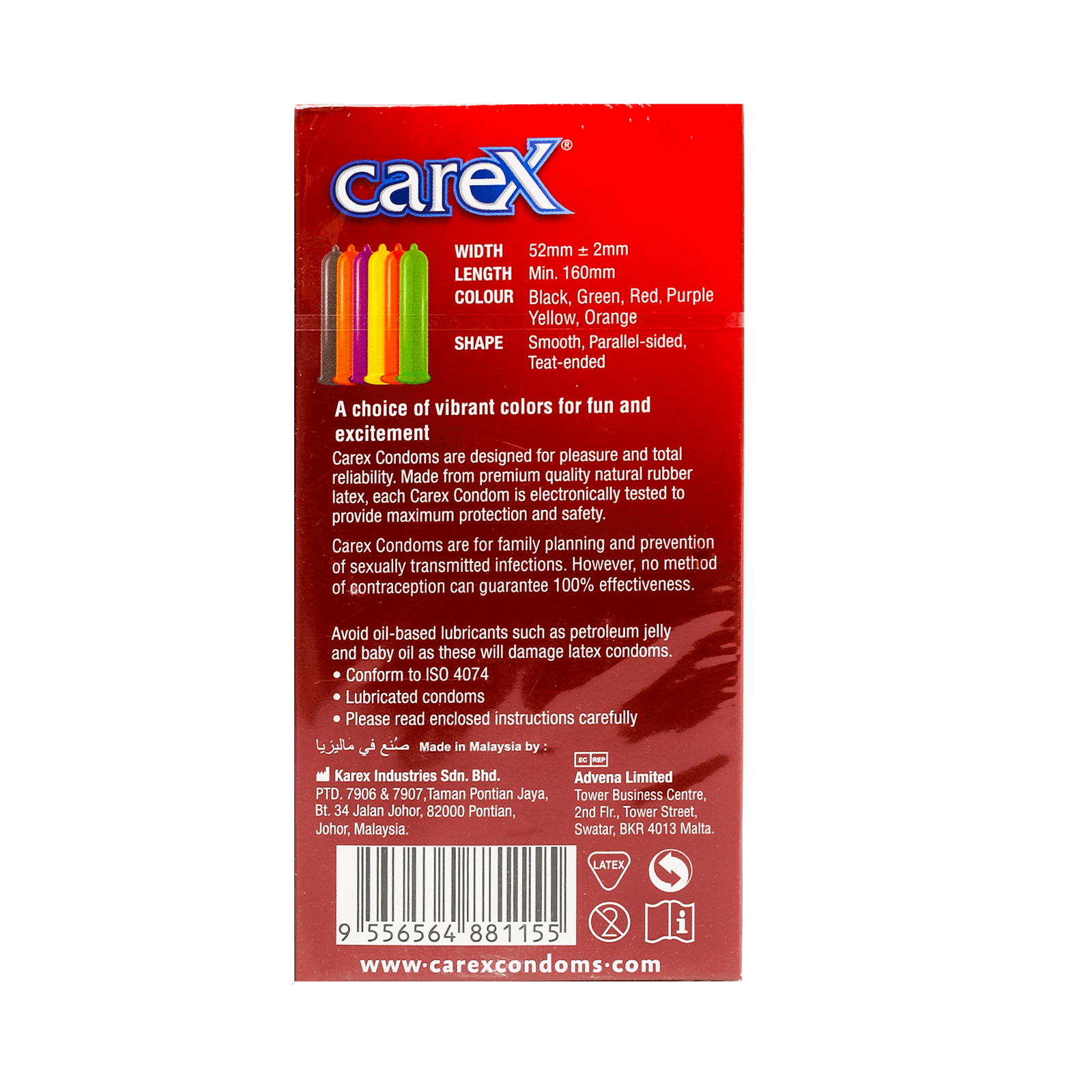 • Carex Condoms - Sensation Assorted Colors are a mixture of colors and flavors for extra passion which include succulent banana, strawberry, grape, orange, apple, and blackcurrant.