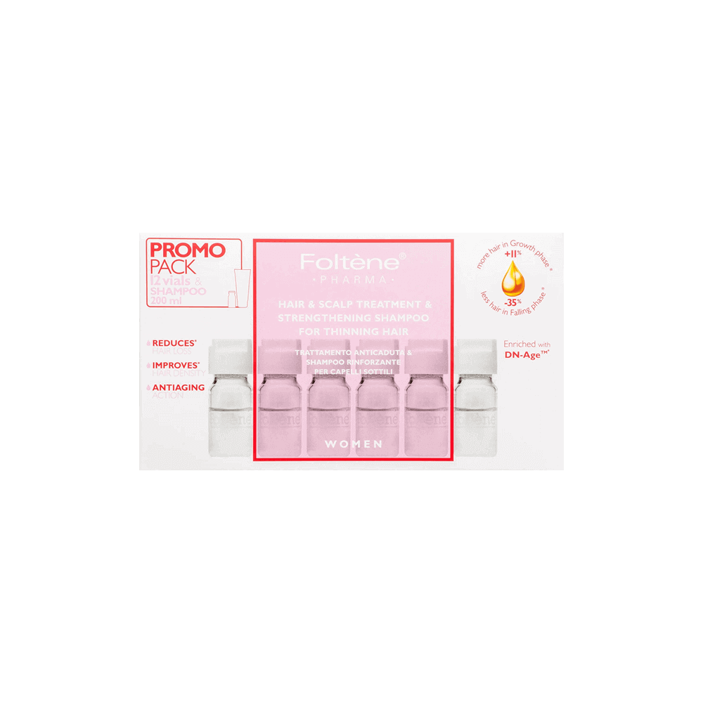 Foltene hair care ampoules for women are complete ampoules that stop hair loss, increase hair density, and stop hair aging.These ampoules contain several Foltene-exclusive compounds such as Tricalgoxyl and DN-Age™ as well as a Biomineral Complex, all of which are extracted from natural sources.