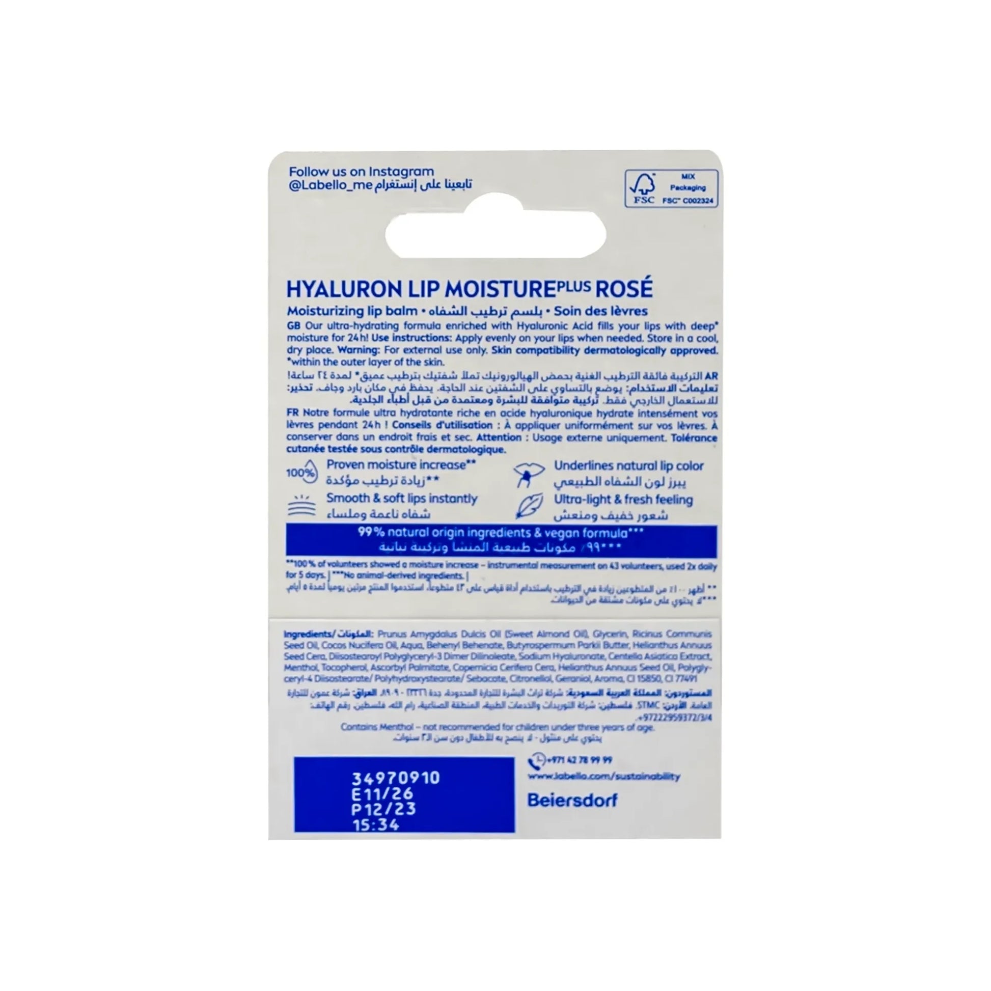 A lip balm with a new and improved formula that moisturizes the lips for 24 hours and enhances their softness, thanks to its formula rich in hyaluronic acid.Hyaluronic acid deeply moisturizes the skin and protects it from dryness. It also enhances the softness of the lips and makes them appear fuller and more rejuvenated.