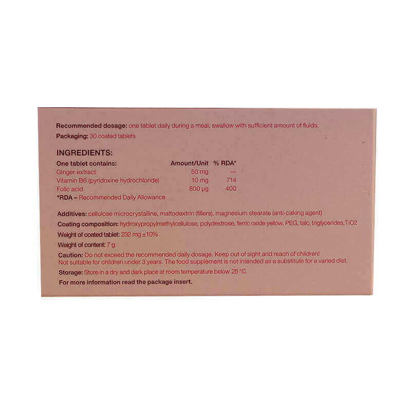 It also contains ginger extract and vitamin B6, which work to relieve the nausea that accompanies the first months of pregnancy.