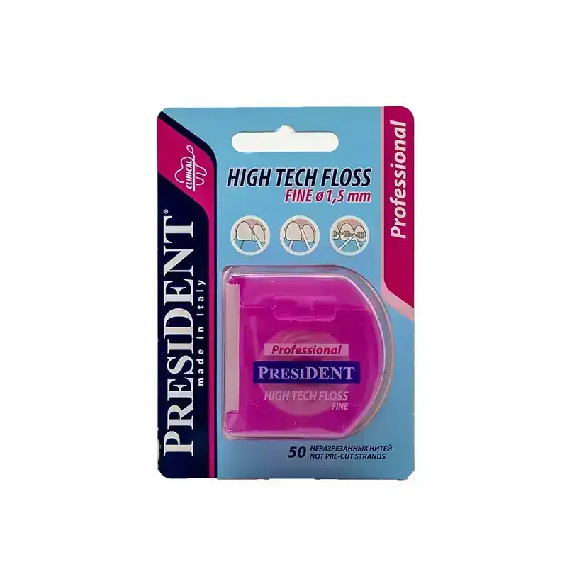 - President Professional High Tech Fine Floss is a flexible floss that contains a sponge area that works to remove dirt and plaque from between the teeth.- The President dental floss is gentle and comfortable to use and cleans the spaces between the teeth without harming the gums or tooth enamel.