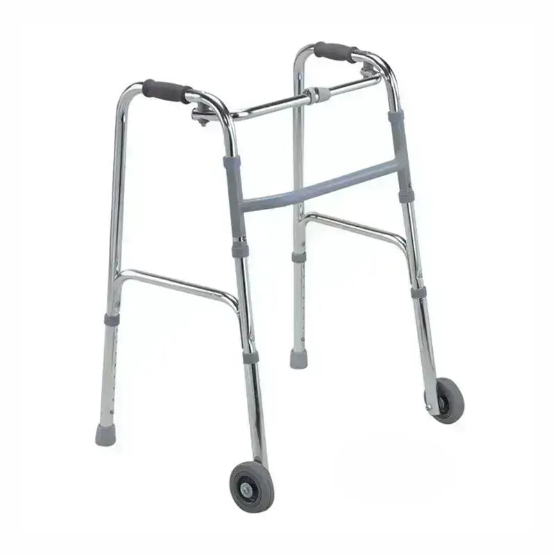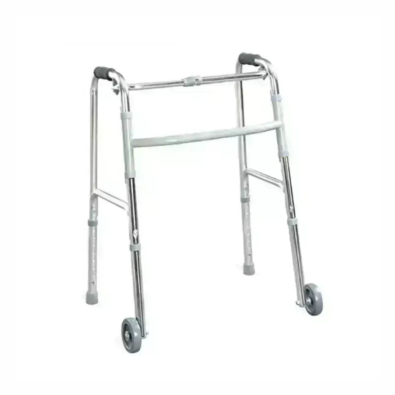 A walker with wheels, four foldable legs, and designed from corrosion-resistant and rust-resistant aluminum.A walker is designed for patients who have difficulty moving and helps them complete daily tasks with ease.